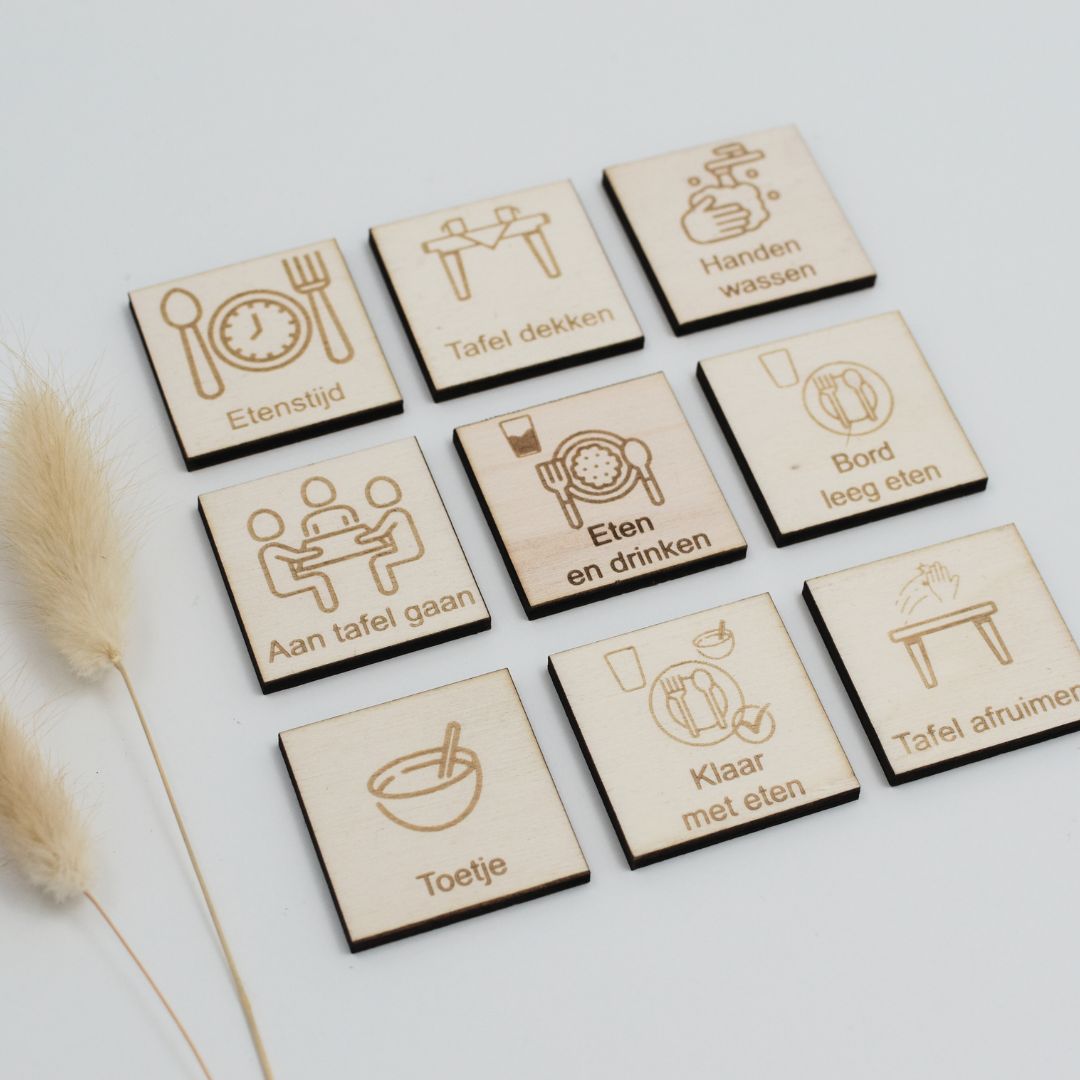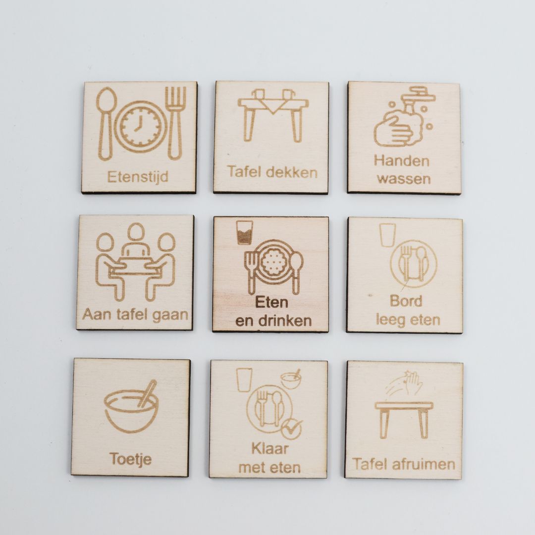 Met deze set breng je rust, structuur en duidelijkheid rond de eetmomenten van de dag. De pictogrammen maken elke stap visueel, waardoor kinderen precies weten wat er van hen wordt verwacht – van het dekken van de tafel tot het afruimen na het eten. Ideaal voor thuis én in de klas of opvang.