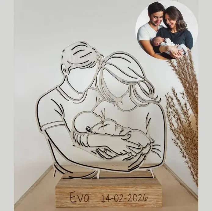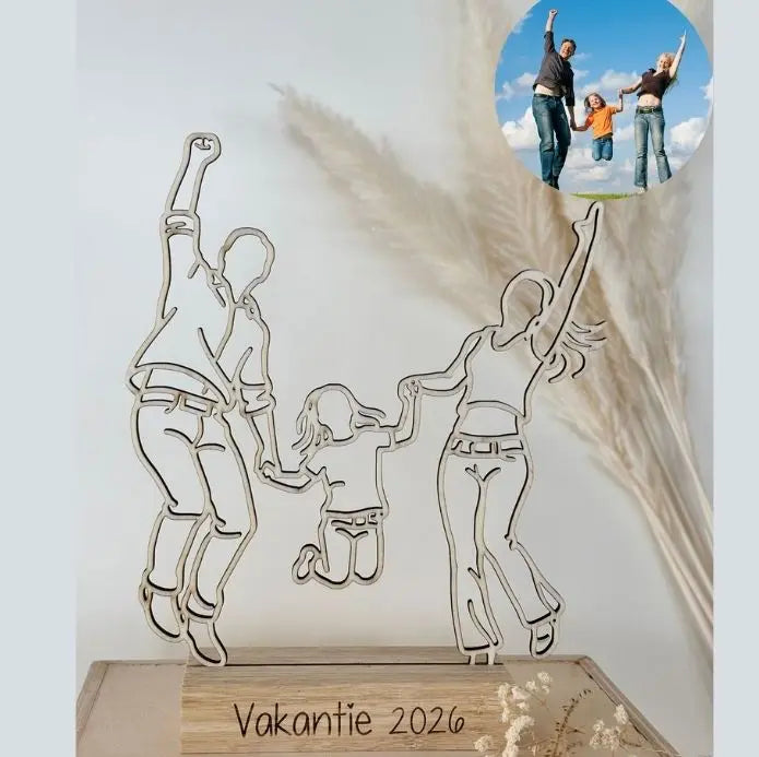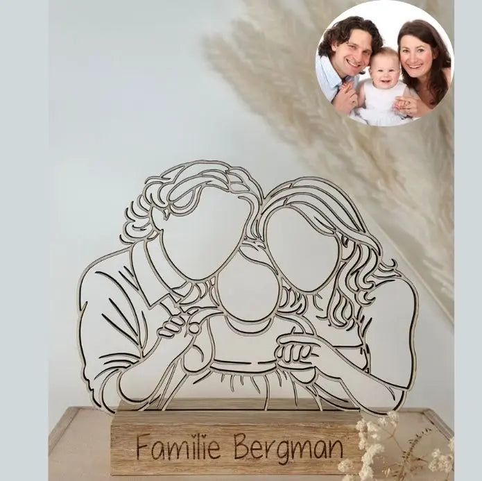 Een moment dat je nooit wilt vergeten, vertaald naar een stijlvol lijnportret van hout. Met dit gepersonaliseerde houten familie lijnbeeld geef je jullie mooiste herinnering een vaste plek in huis. Subtiel, warm en tijdloos.