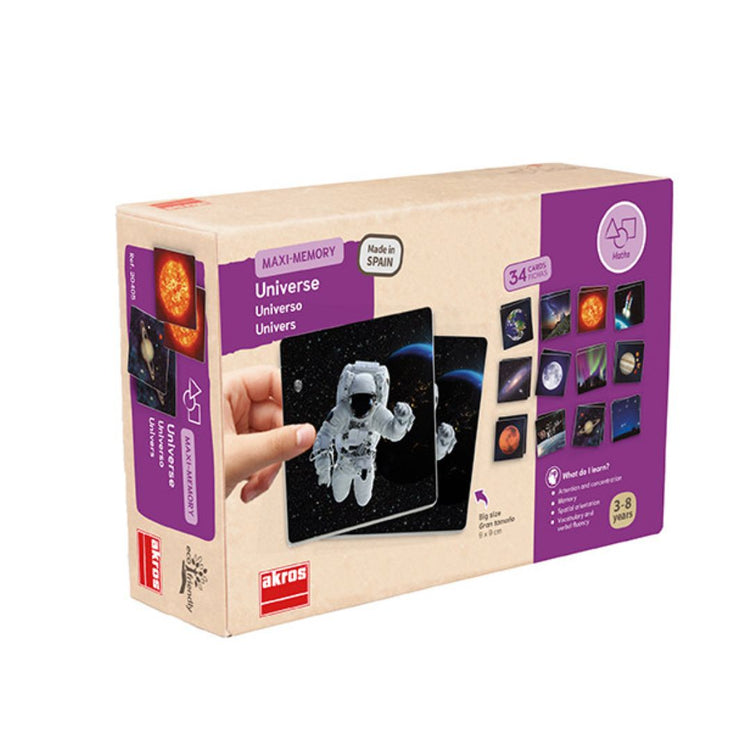 Het Heelal Memory is een uniek memoryspel met grote stevige kaarten vol prachtige afbeeldingen uit het heelal. Kinderen ontdekken spelenderwijs astronauten, planeten, raketten en nevels – terwijl ze hun geheugen en woordenschat trainen.