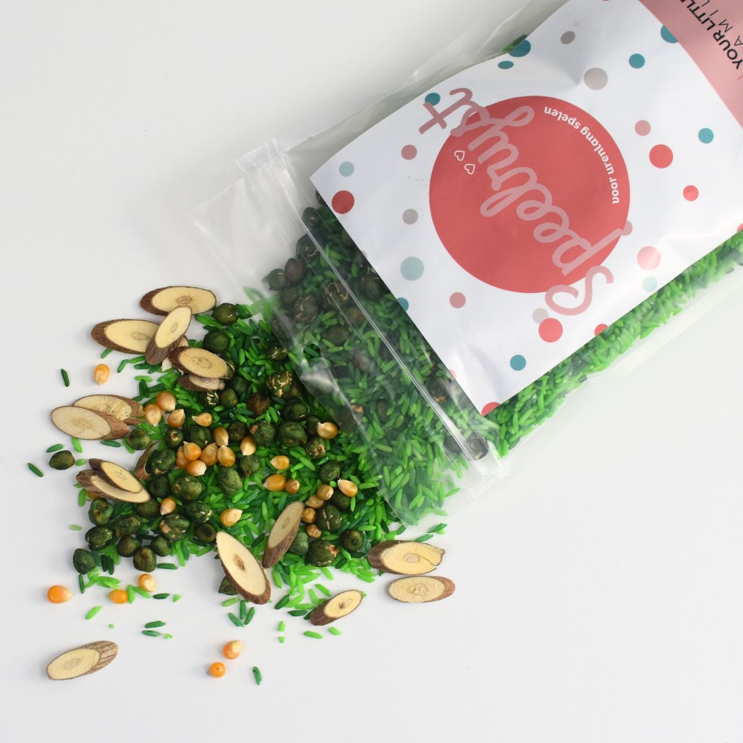 1 kilo Boerderij Mix – gevuld met groene speelrijst, boomtakschijfjes, mais en bloemetjespasta