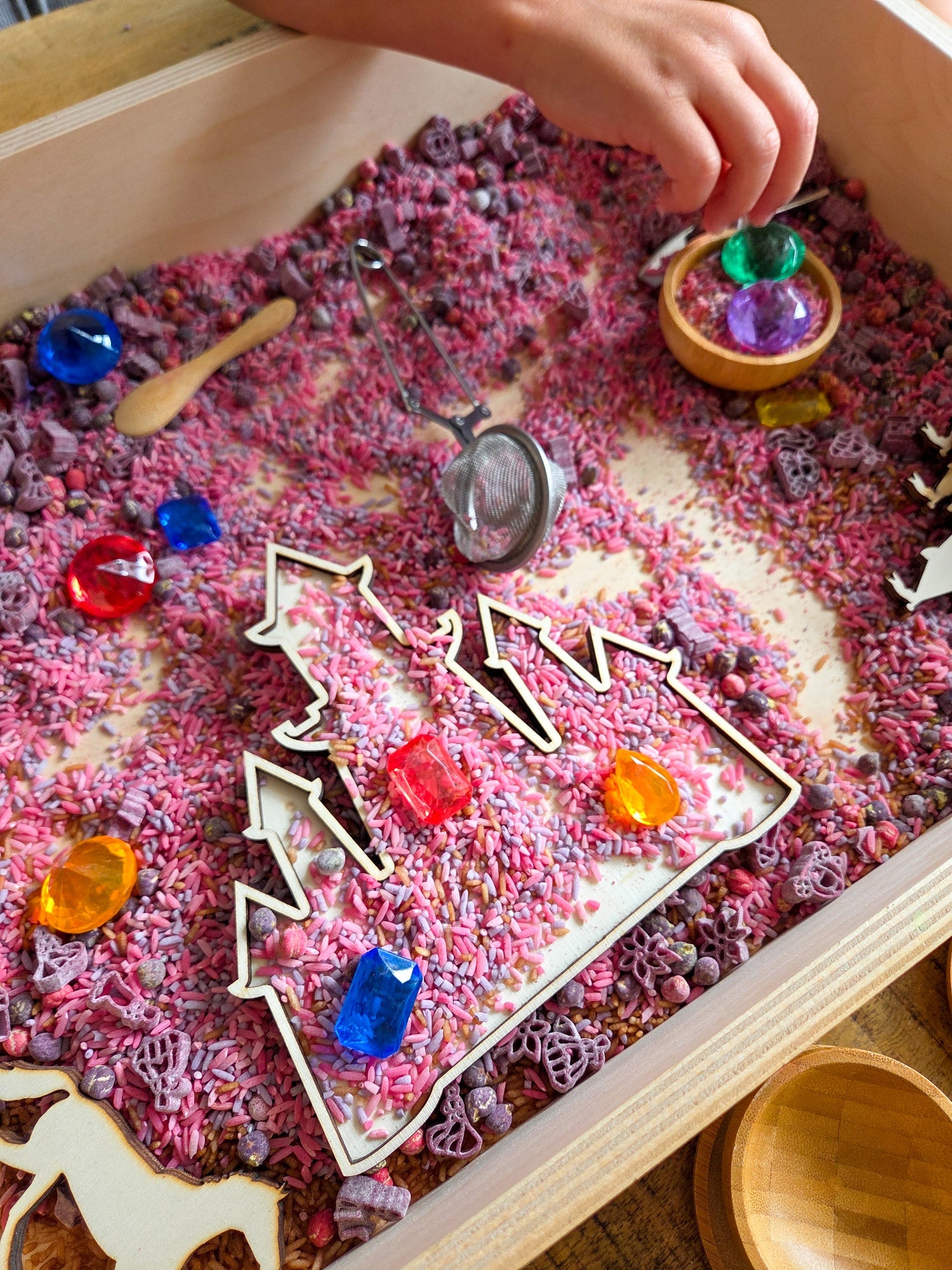 Combineer het kasteel met onze houten speelbak en Prinsessen mix voor een volledige zintuiglijke (sensory play) ervaring die kinderen meeneemt naar een magisch sprookjesavontuur.