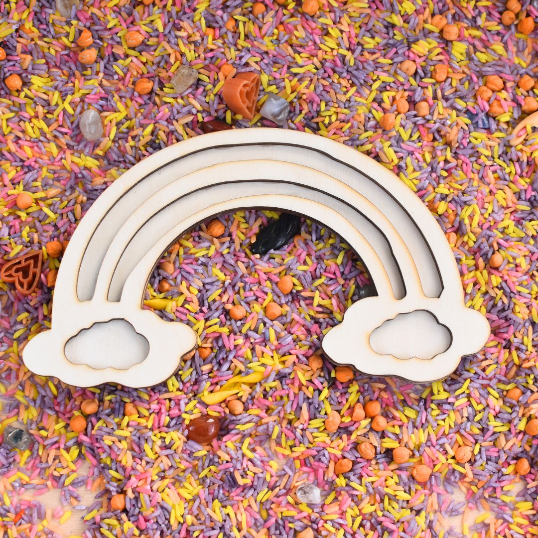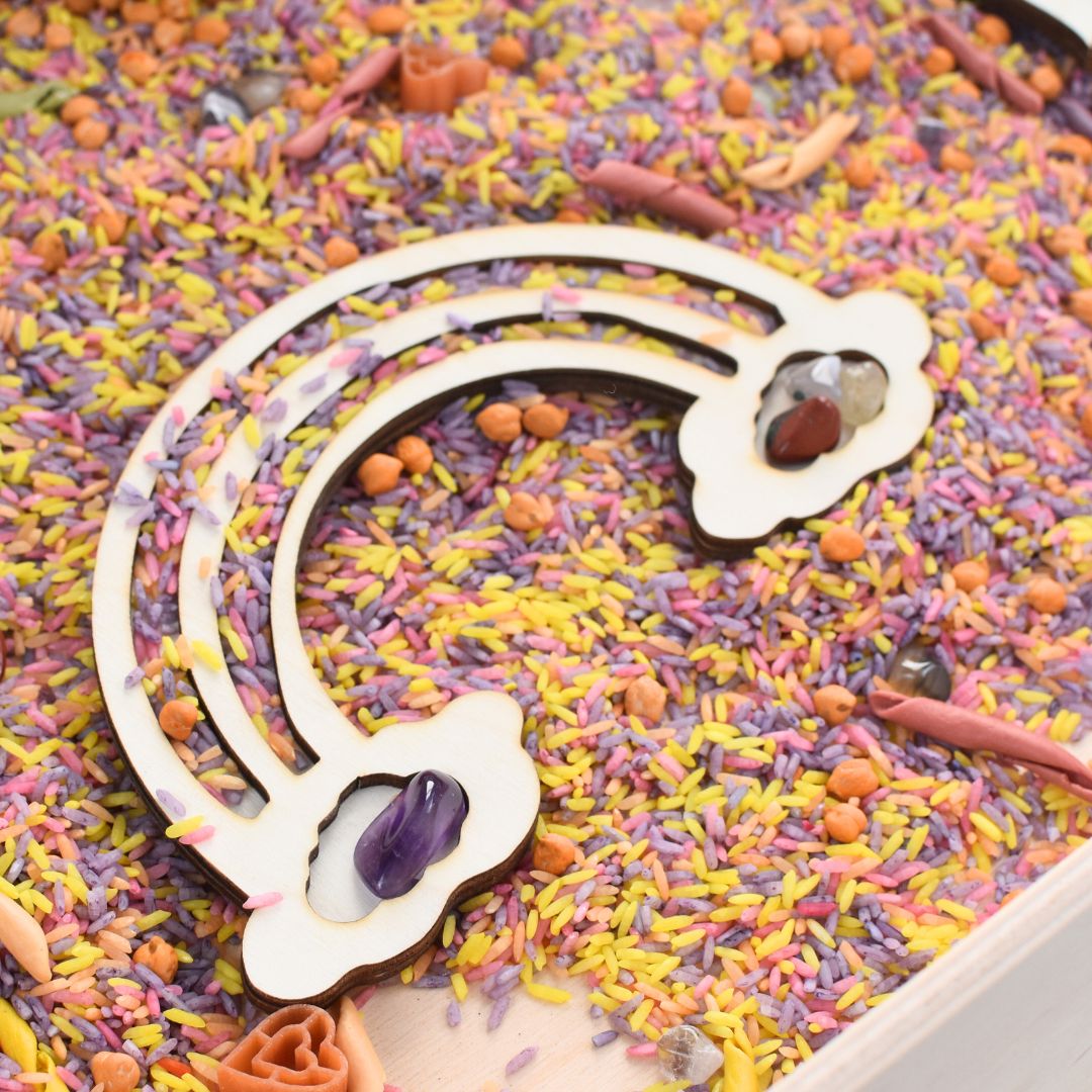 Combineer de regenboog met onze houten speelbak en Unicorn Mix voor een volledige zintuiglijke (sensory play) ervaring die kinderen meeneemt naar een magische wereld vol kleur en fantasie.