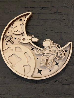 Deze houten maan is gemaakt in onze werkplaats, heeft meerdere lagen voor een speels 3D-effect en zit vol details zoals een astronaut, raket, aarde en sterren. Stoer, avontuurlijk én tijdloos.
