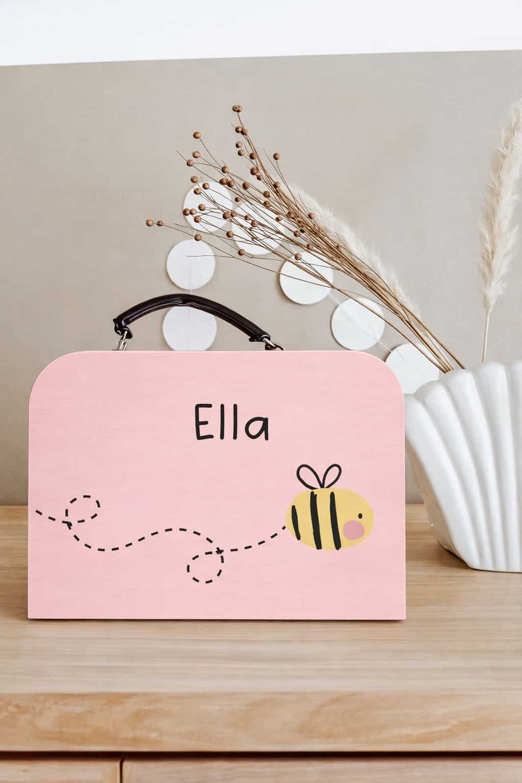 Gepersonaliseerd houten koffertje ‘Ella’ – met bijtje en naam