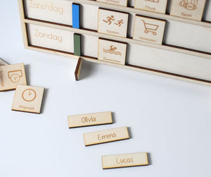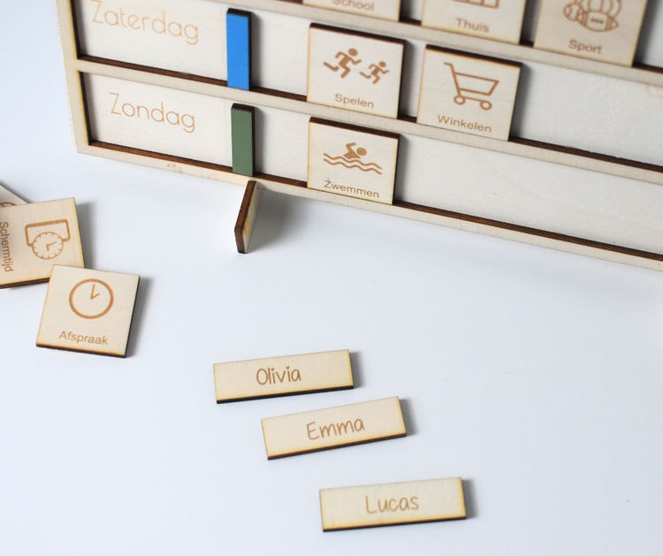Tijdens het bestellen geef je eenvoudig aan welke naam of tekst je op het kaartje wilt. Denk aan: Liam, Emma’s kalender, Aftellen tot de grote dag – helemaal naar wens.