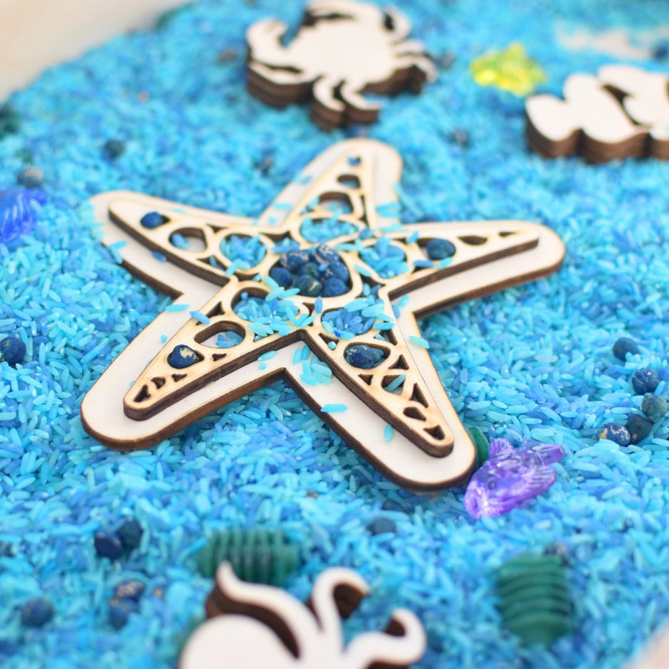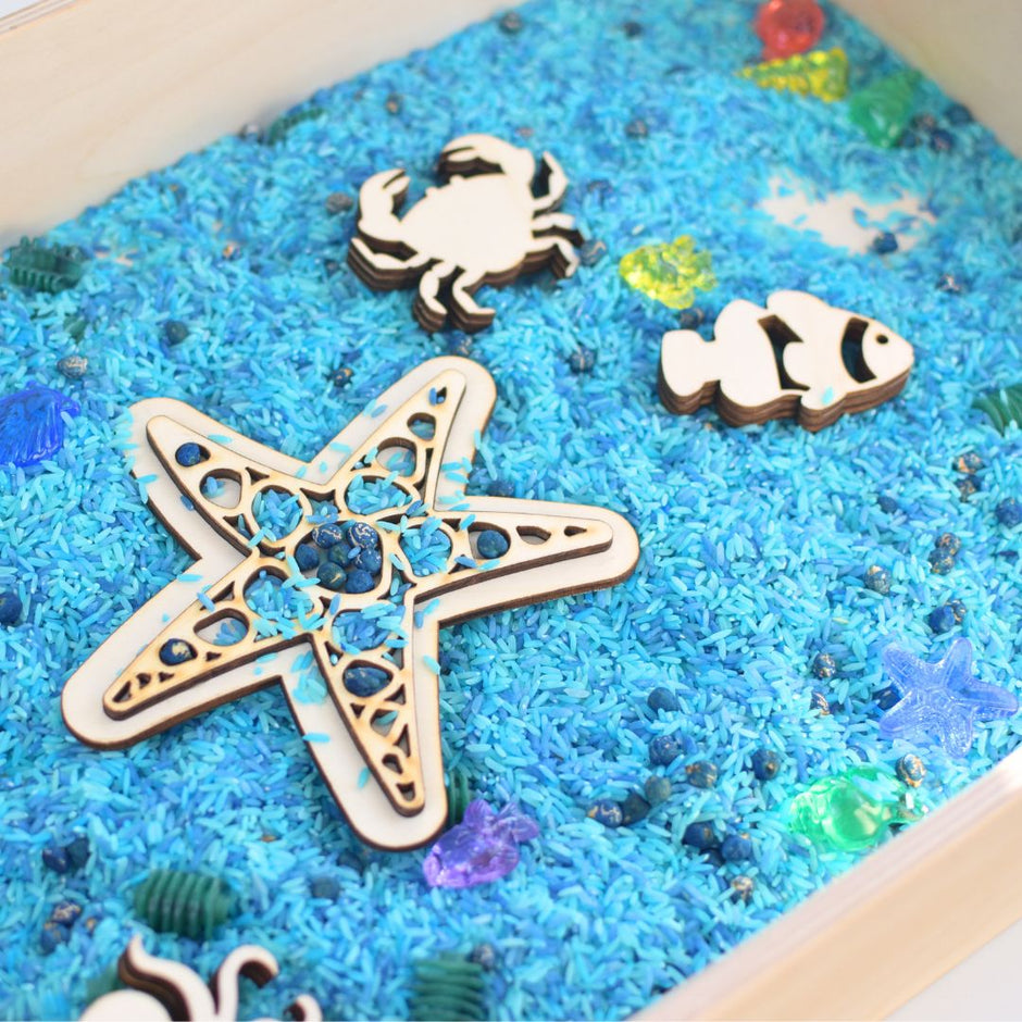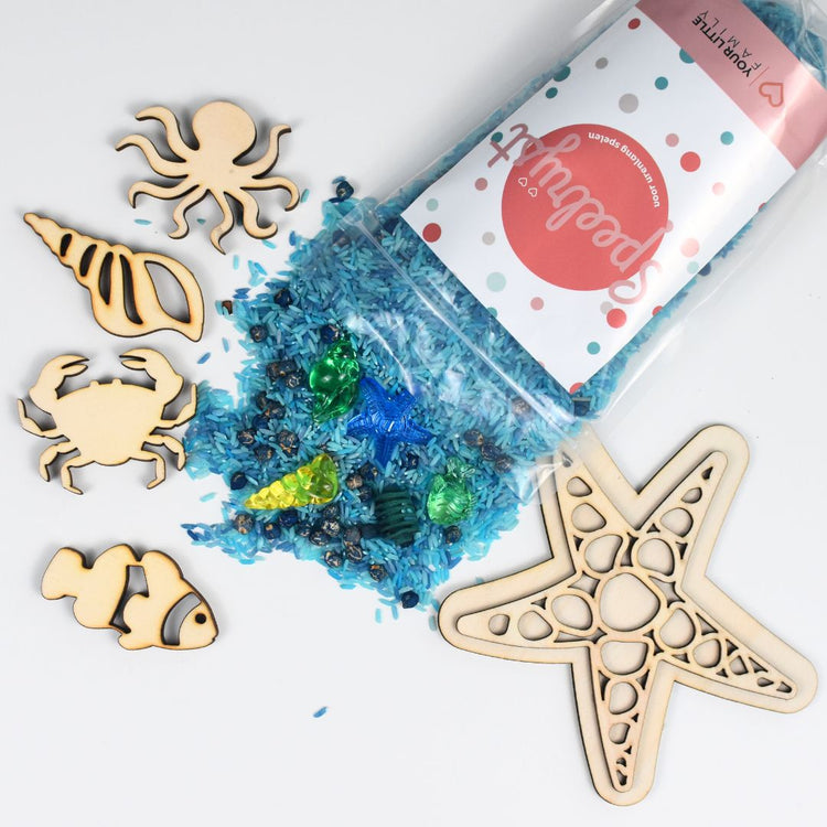 - Speelrijst Oceaanmix (1 kg) – een betoverende mix van blauwe speelrijst in diverse tinten, blauwe speelerwten en groene gekleurde pasta. Inclusief gekleurde plastic zeedieren om je oceaan tot leven te brengen.