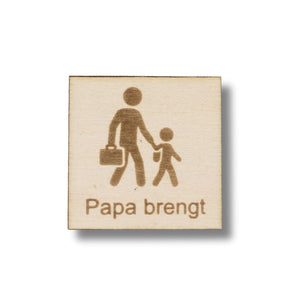 ✔ 4 x 4 cm – stevig hout, met gravure “Papa brengt”