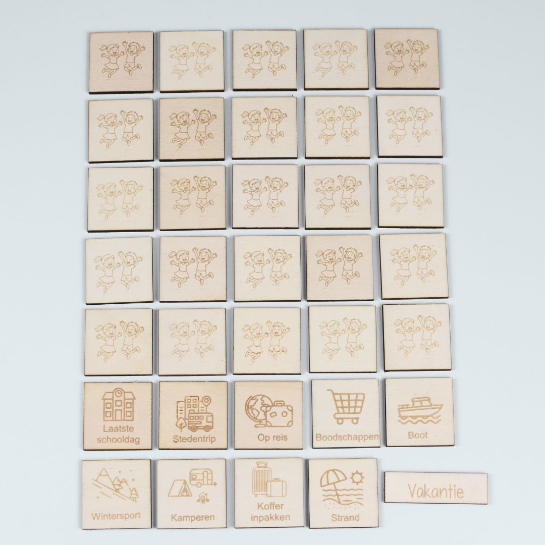 Deze houten pictogrammen passen bij de Vakantie Aftelkalender en geven kinderen houvast en overzicht in de dagen vóór vertrek. Elk pictogram staat voor een herkenbare voorbereidingsactiviteit of vakantiethema — ideaal om samen te praten over wat er gaat komen.