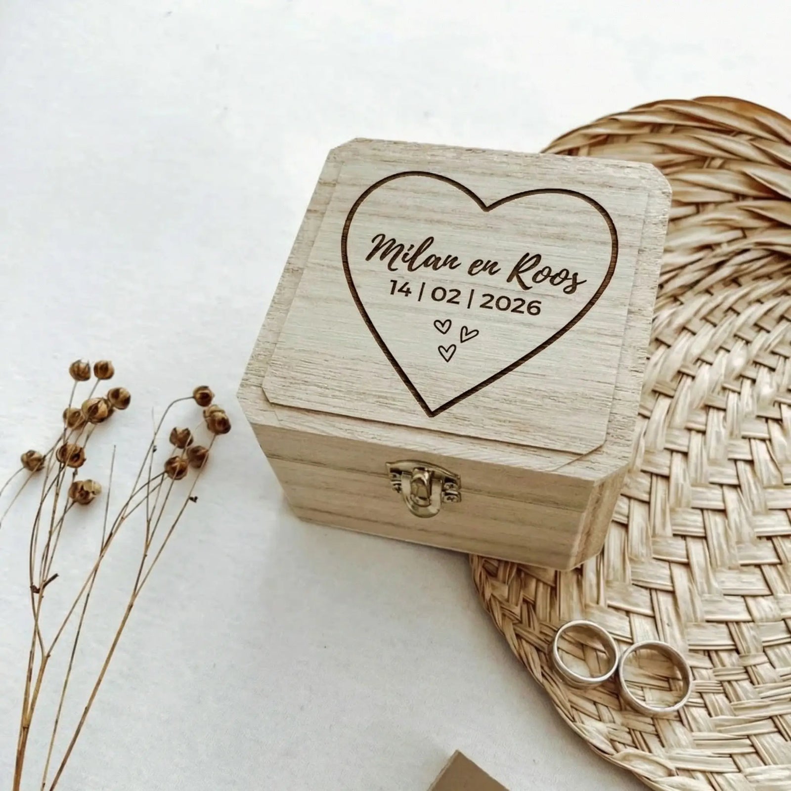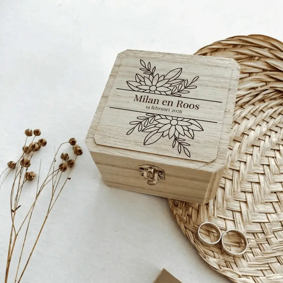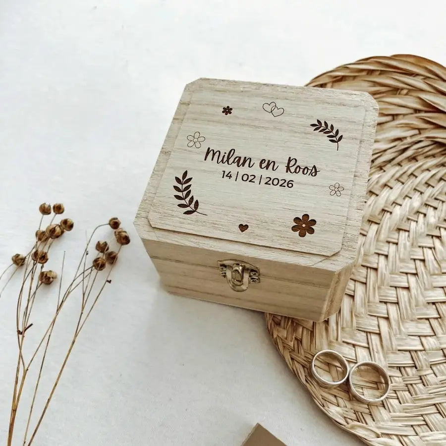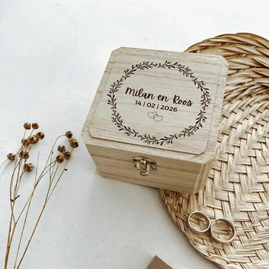 Tijdens het bestellen geven jullie eenvoudig aan welke naam en datum op het ringendoosje gegraveerd mogen worden. De gravering wordt met precisie aangebracht en is volledig kosteloos.