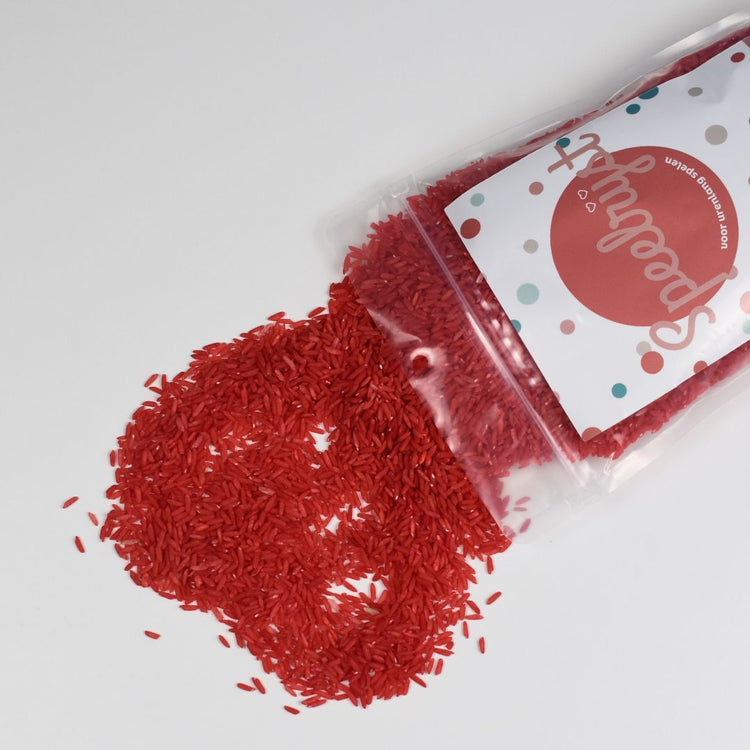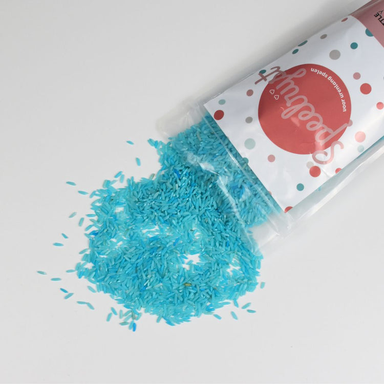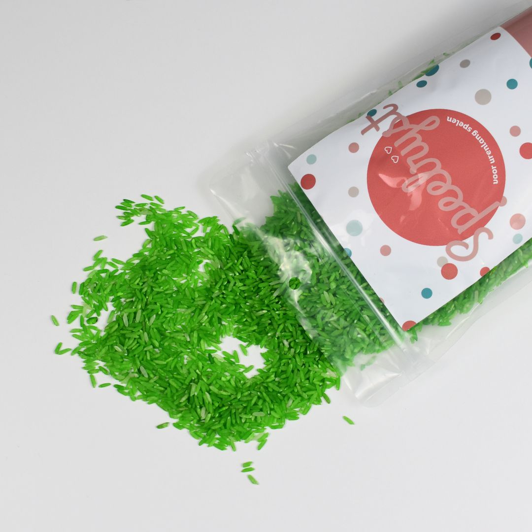 Laat de fantasie van kinderen de vrije loop met deze kleurrijke speelrijst, ideaal voor gebruik in de houten speelbak. Kinderen vinden het heerlijk om de rijst door hun vingers te laten glijden, bakjes te vullen en prachtige patronen en vormen te creëren. Speelrijst biedt niet alleen zintuiglijk plezier, maar stimuleert ook de fijne motoriek en creativiteit. Wil je de speelrijst gebruiken bij onze houten speelbak, dan adviseren wij om de bak te vullen met 1 kilo speelrijst. Zo krijg je een mooie gevulde bak om heerlijk mee te spelen.
