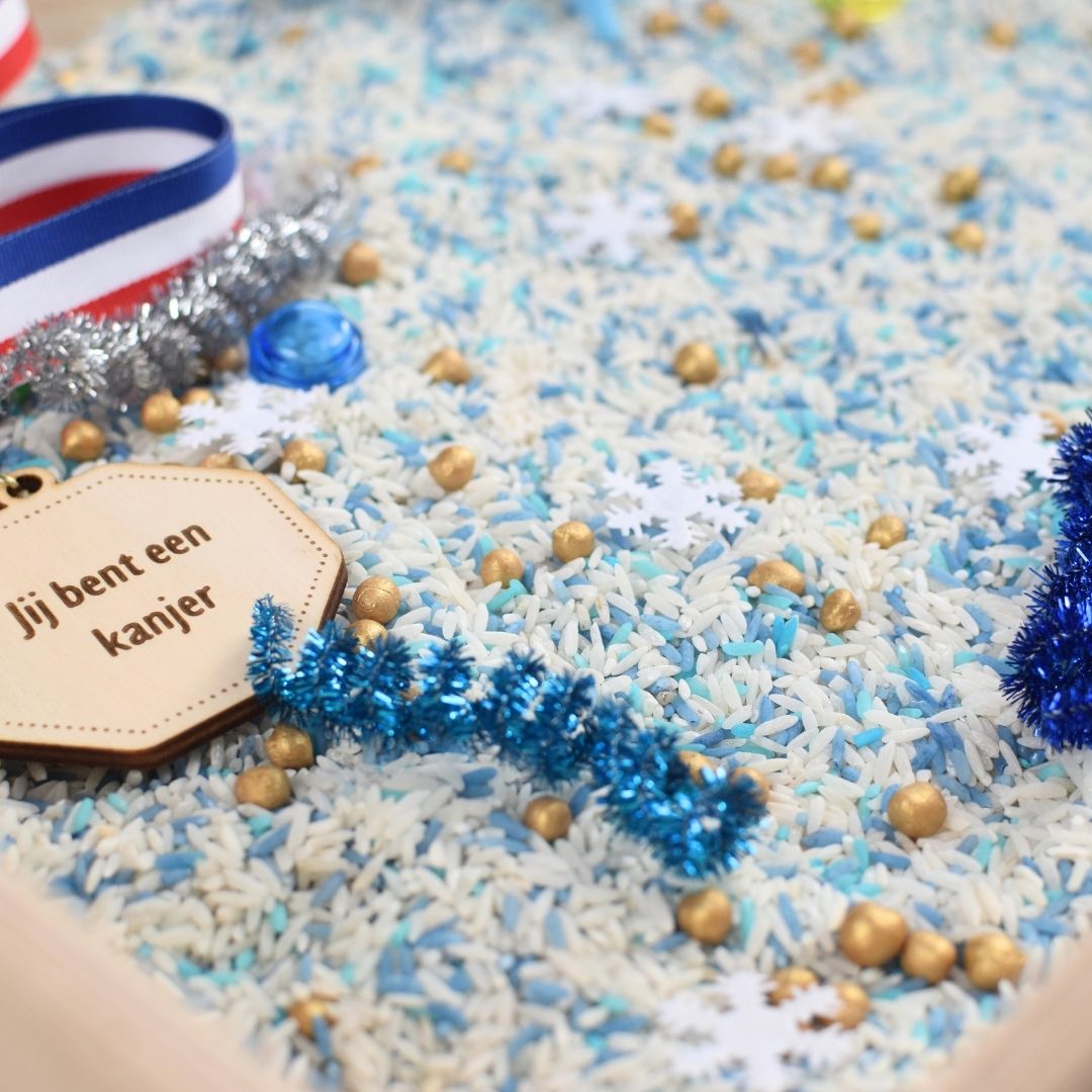 De combinatie van wit en ijsblauw met gouden accenten en glinsterende sneeuwvlokken geeft direct een winterse sfeer. Ideaal voor sensorisch spel, thematafels of als creatieve voorbereiding op de Olympische Spelen.