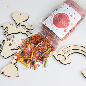 - Speelrijst Unicorn mix (1 kg) – een magische mix van roze, paarse en gele speelrijst, glanzende natuursteentjes, gekleurde speelerwten en pastastukjes in de vorm van hartjes.