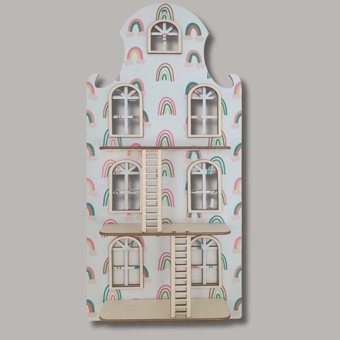 Wand poppenhuis Regenboog – Zacht en speels grachtenpand aan de muur