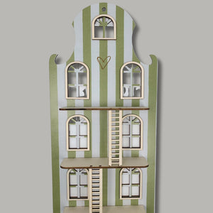 Laat fantasie en sfeer samenkomen in dit unieke wandpoppenhuis met speelse groen-witte strepen. De klassieke vorm van een grachtenpand gecombineerd met frisse, moderne kleuren maakt dit huisje een echte blikvanger. Dankzij de drie verdiepingen, houten plankjes en ladders ontstaat er volop ruimte voor verhalen, figuren en seizoensdecoratie.