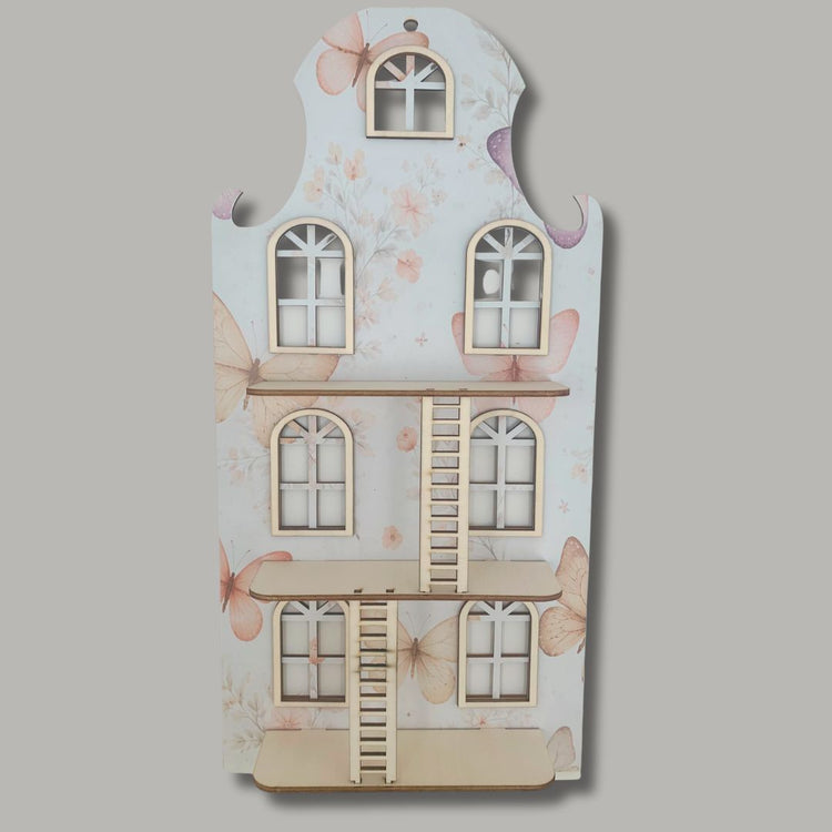 Wand poppenhuis – Klassiek Grachtenpand (trap met print: Vlinders)