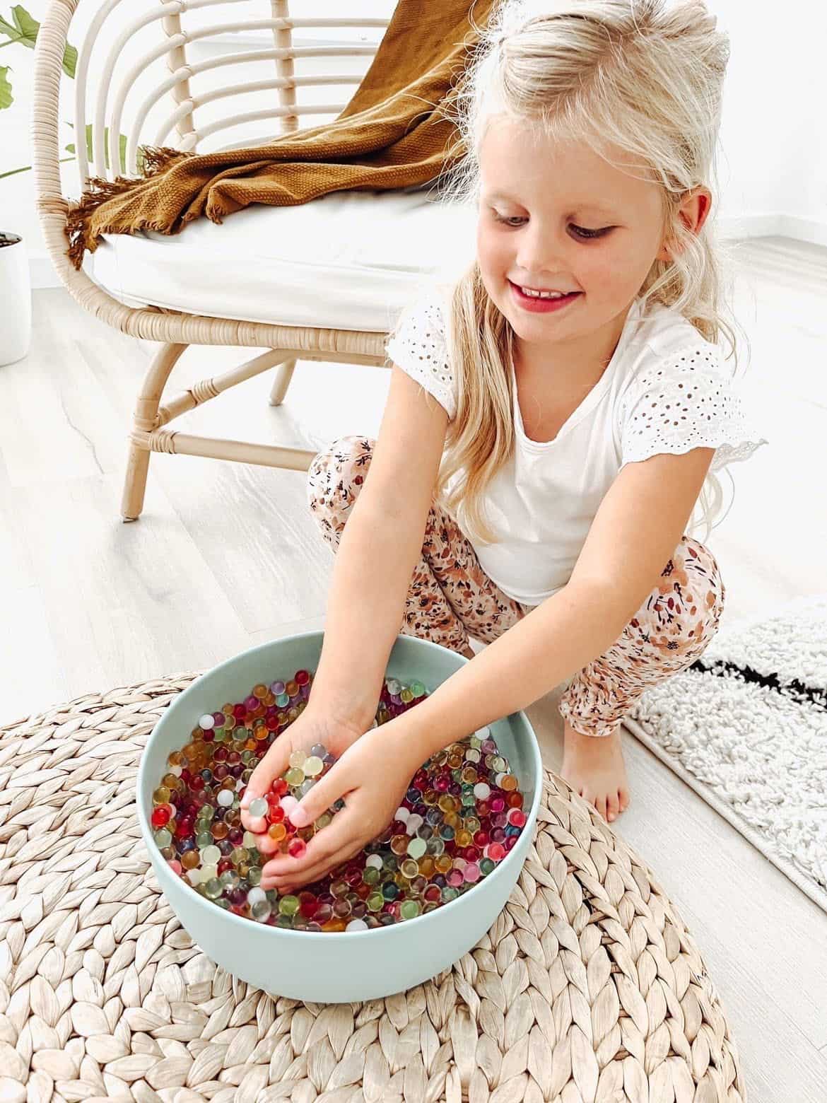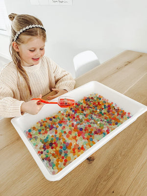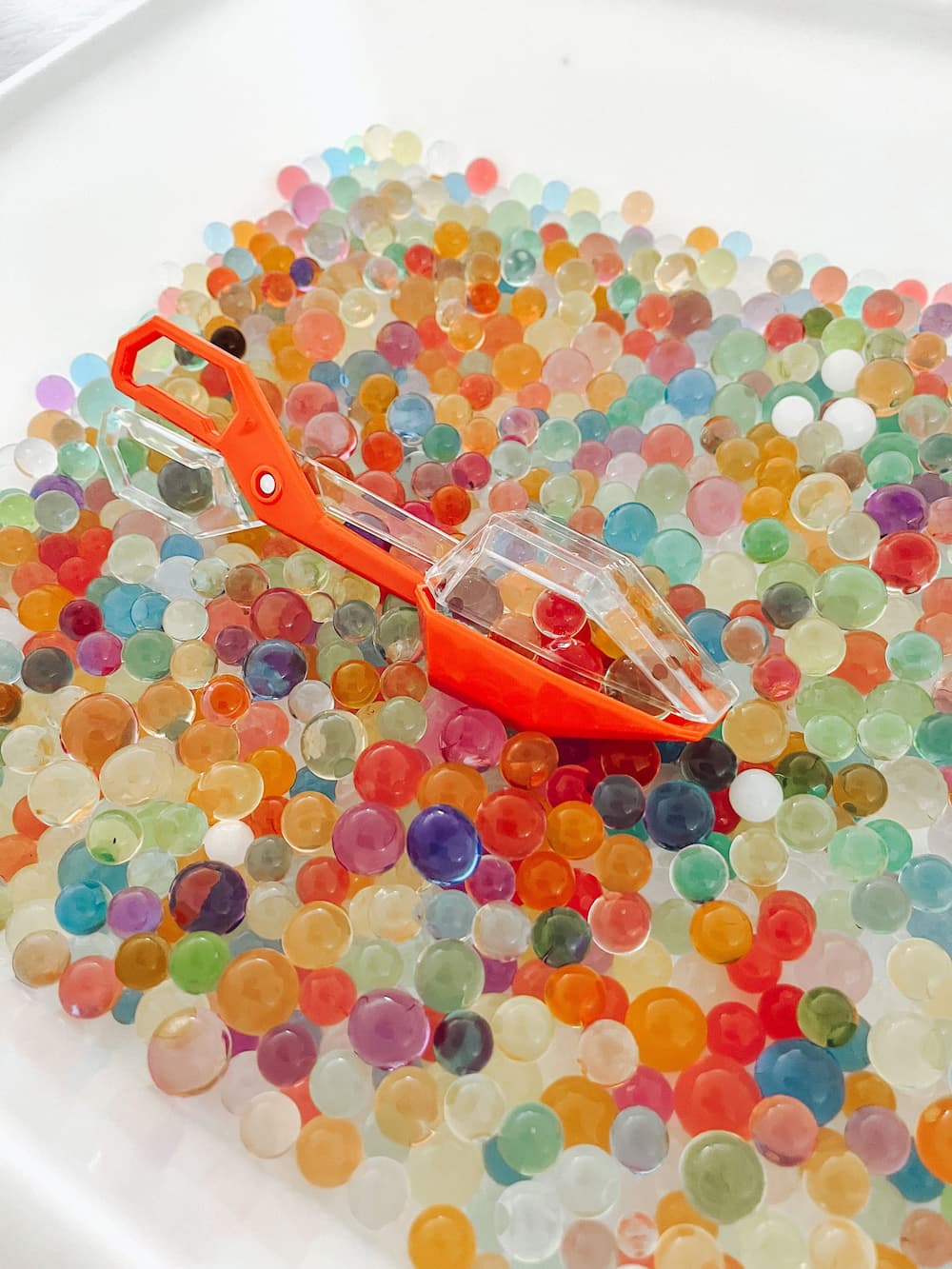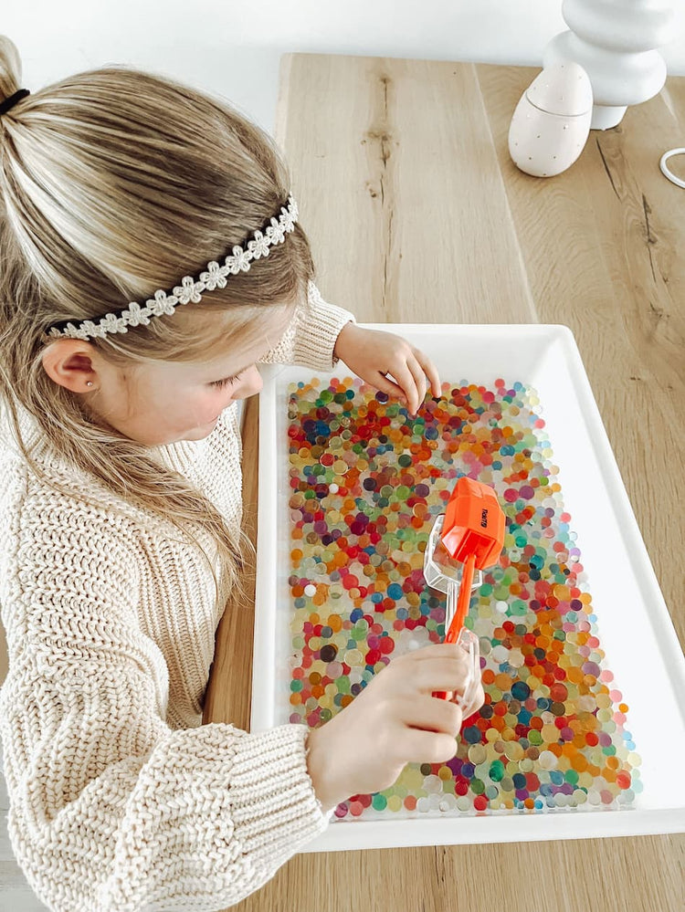 Deze waterparels zijn super leuk voor sensorisch spelen. Erg leuk om in een bak te doen zodat je er met je handen doorheen kan gaan. Ze zijn een beetje glibberig, moeilijk te pakken en ze stuiteren. Het is erg leuk om ze op kleur te sorteren. Of in een bakje, trechter of iets anders te scheppen.