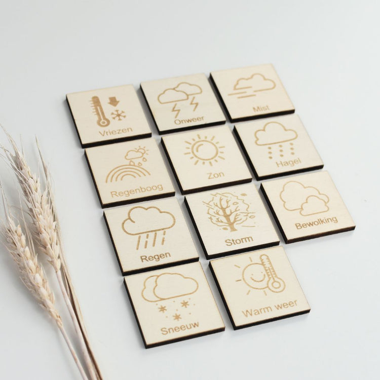 Deze set bevat 11 houten weerpictogrammen van 4x4 cm met gegraveerde symbolen en teksten: